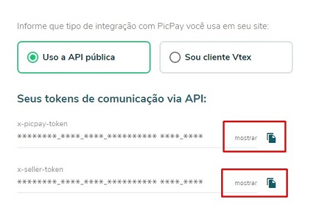 4 - Após clicar no botão "Gerar tokens", será então gerado o "PicPay Token e o Seller Tolen", clique no botão "Mostrar" ao lado de cada um deles, para exibi-los.