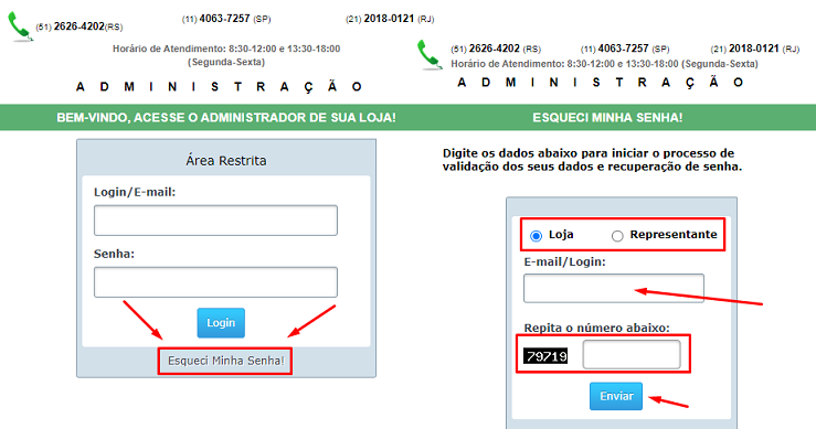 Caso tenha esquecido ou não lembra a sua senha de login, clique no botão "ESQUECI MINHA SENHA!". Na página que vai abrir, escolha se quer recuperar a senha de sua "Loja" ou de sua Conta de "Representante", informe o seu "E-Mail de Login", o "Código de Segurança" e após clique no botão "ENVIAR". Você vai receber um e-mail com uma nova senha, caso não esteja em sua "Caixa de Entrada", verifique sua caixa de "Spam/Lixo Eletrônico". Veja imagem abaixo: