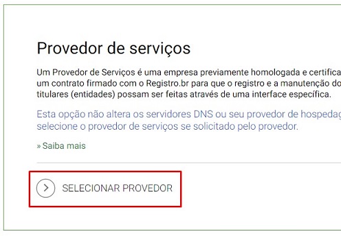 3 - Na próxima página, desça até "PROVEDOR DE SERVIÇOS" e clique no botão "SELECIONAR PROVEDOR".