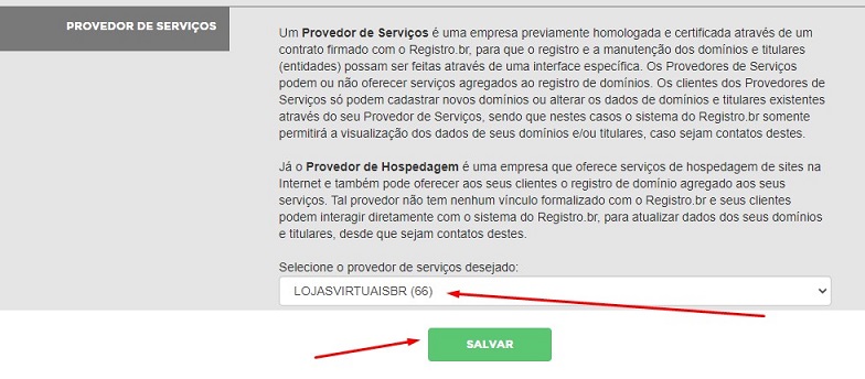 4 - Em "PROVEDOR DE SERVIÇOS", selecione "LOJASVIRTUAISBR (66)" e clique no botão "SALVAR".