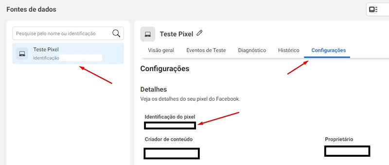 3 - Na tela inicial em "Fontes de Dados", clique no nome do seu "Pixel" e após clique em "Configurações" e em "Identificação do pixel" será exibido o "Número do seu Pixel".