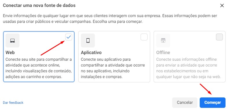 4 - Na tela que irá abrir, selecione a opção "Web" e após clique no botão "Começar".