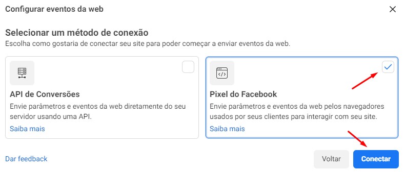 5 - Na tela seguinte, selecione a opção "Pixel do Facebook" e após clique no botão "Conectar".