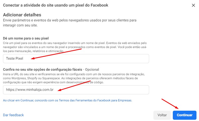 6 - Na próxima tela, informe o "Nome" do seu Pixel e o "Domínio" de sua loja, após clique no botão "Continuar".