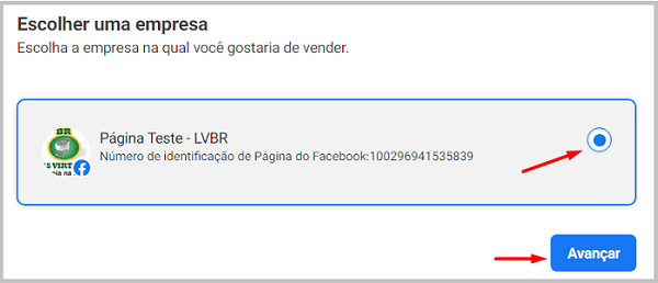 4. Na seção Escolha sua empresa, será exibida uma lista de Páginas do Facebook que você administra. Selecione a empresa à qual você deseja adicionar sua loja. Clique em Avançar.
