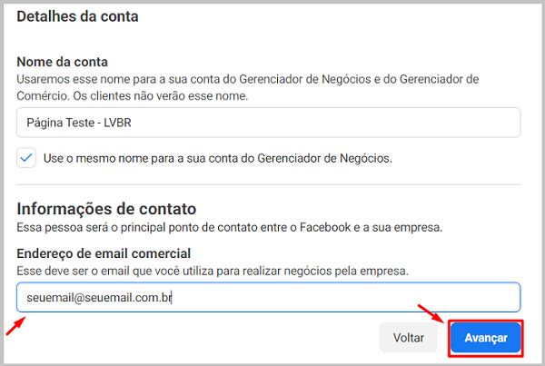5. Informe o Nome da conta, insira seu endereço de e-mail (deve ser um e-mail válido). Clique em Avançar.