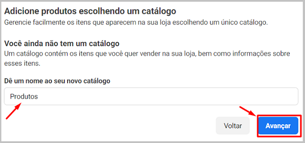 7. Na seção Adicione um catálogo para mostrar seus itens, selecione um catálogo existente ou crie um novo e clique em Avançar.