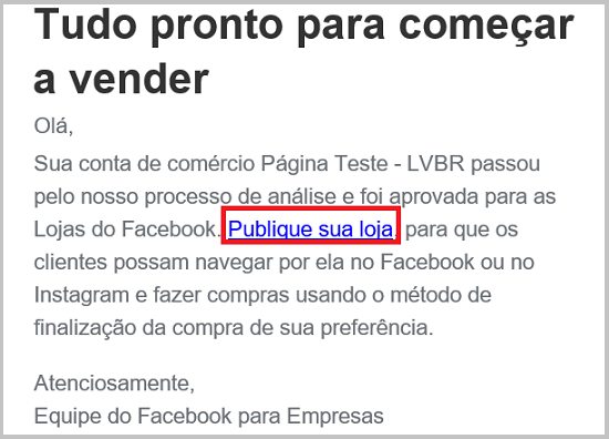 9. Você criou sua loja. Será necessário aguardar o Facebook aprovar sua loja, o prazo estipulado pelo Facebook é em média 24 horas. Assim que o Facebook aprovar sua loja, você receberá um e-mail conforme imagem abaixo, nesse e-mail deve clicar no link "Publique sua loja".