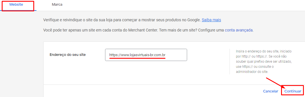 3 - Na aba "WEBSITE", informe a URL de seu site e clique em "CONTINUAR".