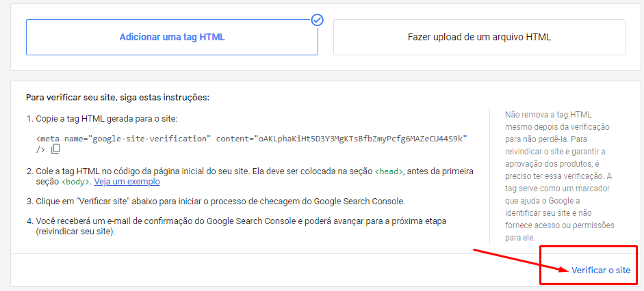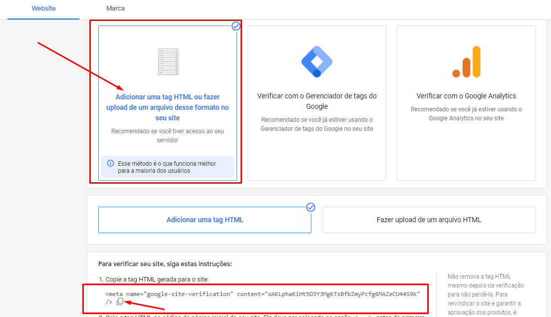 4 - Abrirá as opções de verificação de site, selecione a opção "ADICIONAR UMA TAG HTML OU FAZER UPLOAD DE UM ARQUIVO DESSE FORMATO NO SEU SITE" e COPIE a tag HTML que será exibida.