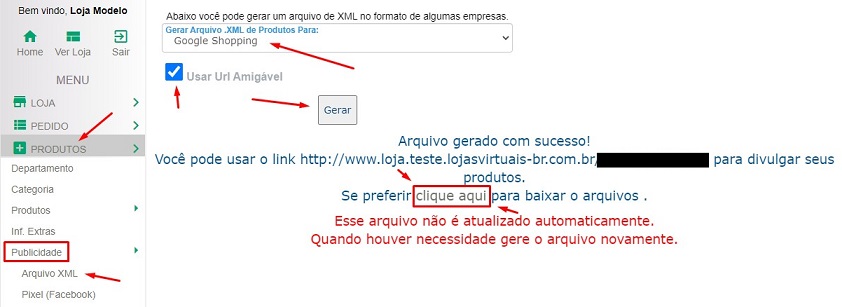 1 - Para gerar o "Arquivo XML" de seus produtos, acesse o "Painel de Administrador" de sua loja, vá no menu "PRODUTOS>PUBLICIDADE>ARQUIVO XML". No final da página verá a opção para gerar o Arquivo XML, selecione a opção "Google Shopping", marque a opção "Usar Url Amigável" e após clique no botão "Gerar". Vai aparecer a mensagem "Arquivo gerado com sucesso!", em seguida clique no botão "clique aqui", para salvar o arquivo em seu computador.