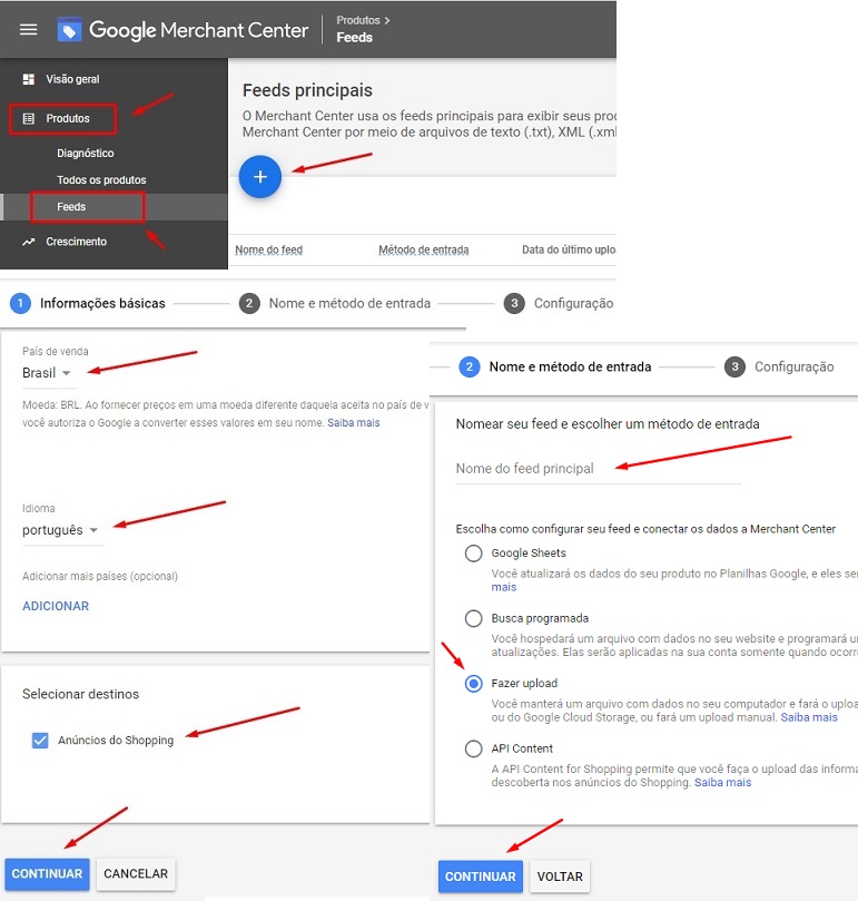 2 - No painel do Google Merchant, clique no menu "PRODUTOS > FEEDS" e em "Feeds principais", clique no botão "Adicionar feed principal" (indicado pelo sinal de "+"). Na próxima tela que irá abrir, selecione o "País de venda (Brasil)", o "Idioma (Português)", marque a opção "Anúncios do Shopping" e clique no botão "Continuar". Na próxima tela preencha o "Nome do feed principal", marque a opção "Fazer Upload" e clique no botão "CONTINUAR".