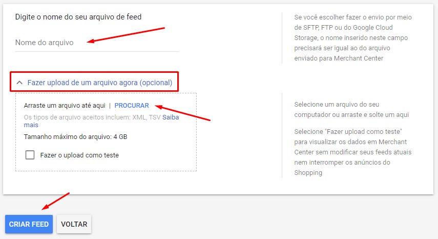 3 - Na próxima tela, insira o "Nome do arquivo", clique em "Fazer upload de um arquivo agora", clique em "PROCURAR", selecione o arquivo que você gerou e realizou o download nos passos anteriores em seu computador (na pasta de Downloads), após clique no botão "CRIAR FEED".